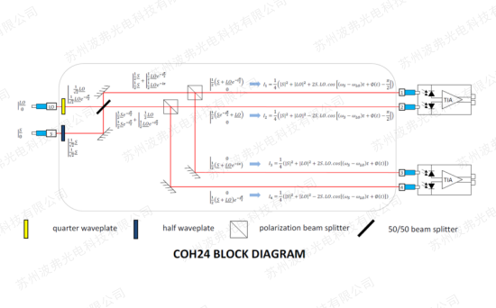 90°光混頻器(超鏈接)在相干光通信系統(tǒng)中的主要作用是將兩束頻率接近、相位差恒定的且偏振方向相同的信號光與本振光波進行相干混頻,再利用光電平衡探測器和信號處理對中頻信號進行分析,可以看出其原理上也是一種調(diào)制解調(diào)器。常見的 90°光混頻器為2(輸入)x4(輸出)端口結(jié)構(gòu),如上圖,其由分立的四分之一波片、半波片和偏振分光鏡等光學元器件構(gòu)成,四個輸出端分別相差為0°、180°、90°和270°。0°與180°輸出端經(jīng)過平衡探測器后的支路稱為同相I支路,90°與270°輸出端經(jīng)過平衡探測器后的支路稱為正交Q支路。