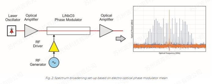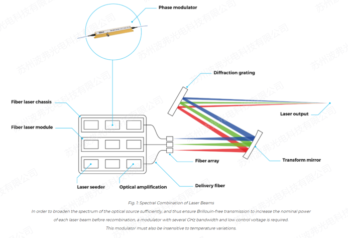 這些激光器中的每一路都通過電光相位調(diào)制器進(jìn)行頻率調(diào)制,后者對于抑制光纖中的非線性布里淵效應(yīng)(也稱為受激布里淵散射SBS)是尤為必要的。事實(shí)上,在光纖中傳輸?shù)倪^大功率會在玻璃結(jié)構(gòu)中引發(fā)聲格振動。這種振動會導(dǎo)致布拉格光柵效應(yīng)限制光的傳輸:相當(dāng)一部分光被反射,可能會損壞種子光源及其增益介質(zhì)。抑制布里淵效應(yīng)的一個行之有效的方法是展寬激光器的線寬(頻率調(diào)制)。通過鏈路中加入電光相位調(diào)制器,使這項(xiàng)技術(shù)成為可能。因此,在光譜合成系統(tǒng)中,每個通道的窄線寬激光器后面都配備有一個或者多個相位調(diào)制器。