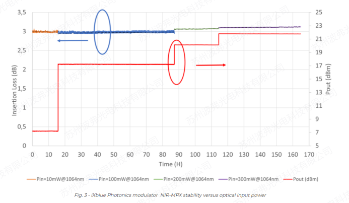 iXblue相位調(diào)制器NIR-MPX為1064 nm近紅外波段開發(fā),得益于對“質(zhì)子退火交換”(APE)波導(dǎo)制造工藝的技術(shù)掌握(也用于我們自己的光纖螺儀中的Y波導(dǎo)),因此,APE波導(dǎo)可以承受幾百毫瓦的光強(qiáng)。