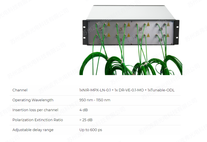 NIR-MPX-LN-0.1及其匹配放大器DR-VE-0.1-MO都是高功率相干光束合成應(yīng)用的理想選擇。NIR-MPX-LN-0.1也使用質(zhì)子交換技術(shù)(APE)工藝生產(chǎn)。由此產(chǎn)生的偏振波導(dǎo)可以在光波導(dǎo)芯片的輸出端產(chǎn)生大于60db的偏振消光比。APE工藝也有助于實(shí)現(xiàn)300MW的高光輸入功率處理。該調(diào)制器還具有插入損耗小、光學(xué)穩(wěn)定性高等特點(diǎn)。