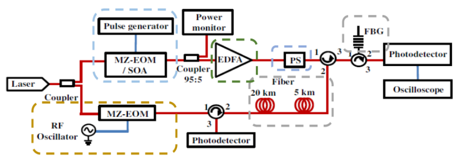 如下圖,窄線寬激光器通過高消光比強(qiáng)度調(diào)制器(>40dB,系統(tǒng)可實(shí)現(xiàn)100dB高消光比),帶寬~10.8GHz,經(jīng)過脈沖調(diào)制,經(jīng)過EDFA放大后,通過擾偏器消除偏振影響,再通過環(huán)形器實(shí)現(xiàn)遠(yuǎn)距離傳輸,和經(jīng)過FBG濾波后,通過光電探測器解調(diào)和檢波。