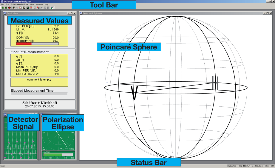 耦合到偏振分析器的輻射在被光電檢測器記錄之前通過旋轉的四分之一波片和固定的偏振器。軟件 SKPolarizationAnalyzer 評估從光電二極管信號的詳細分析和四分之一波片的時間/位置信息中檢索到的斯托克斯參數。然后在龐加萊球上描繪偏振狀態,其中任何偏振狀態的變化,包括旋轉方向(描繪在北半球或南半球)都很容易看到。同時顯示了偏振橢圓,偏振狀態的常見表示。 對于相干性低的源,DOP 橢圓補充了偏振可視化。