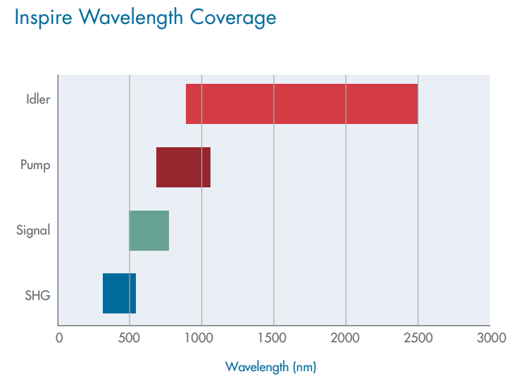 基于RadiantisTM專(zhuān)利技術(shù),InspireTM可在345–2500 nm的光譜范圍內(nèi)無(wú)間隙地提供具有高平均功率的接近變換限制的脈沖。憑借一套光學(xué)器件和一個(gè)標(biāo)準(zhǔn)配置,Inspire?的獨(dú)特設(shè)計(jì)提供了對(duì)整個(gè)系列的一流訪問(wèn),無(wú)需更改配置并確保同時(shí)訪問(wèn)可見(jiàn)光和紅外光。四個(gè)獨(dú)立的輸出端口提供一流的光譜覆蓋范圍,包括雙泵浦(345–520 nm)、信號(hào)(490–750 nm)、惰輪(930–2500 nm)和耗盡泵浦(640–1040 nm)。