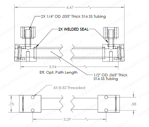 標準光路(相互作用)長度為 10 厘米,但可根據(jù)要求提供定制光路長度。 流通池的通光孔徑為 0.375 英寸或 9.5 毫米。