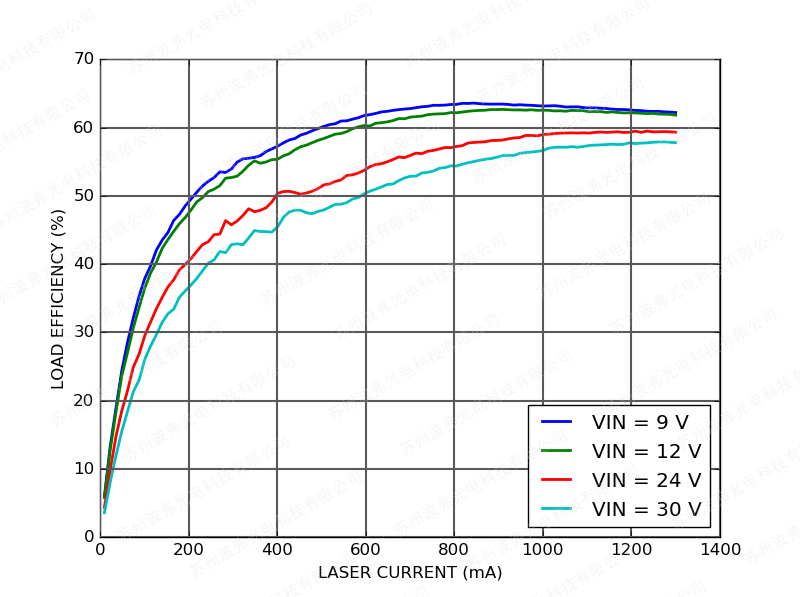 下圖顯示了具有200 mV激光驅動器壓降的CTL300E-1-1200控制器的整體負載效率(=激光電功率/輸入功率)。