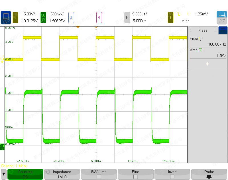 使用具有400 mV激光驅動器壓降的Thorlabs BL976-SAG300泵浦激光二極管在100 mA和600 mA之間切換的示例(黃色:BSEL信號3.3 V 100 kHz,綠色:激光二極管輸出功率):