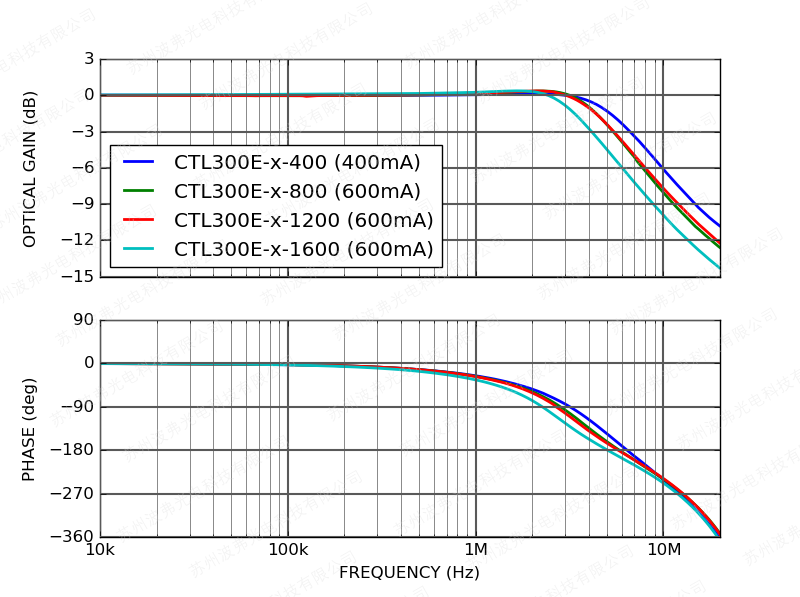 下圖顯示了CTL300E控制器在1 Vpp輸入調制電壓幅度和400 mV激光驅動器壓降下測得的調制頻率響應。