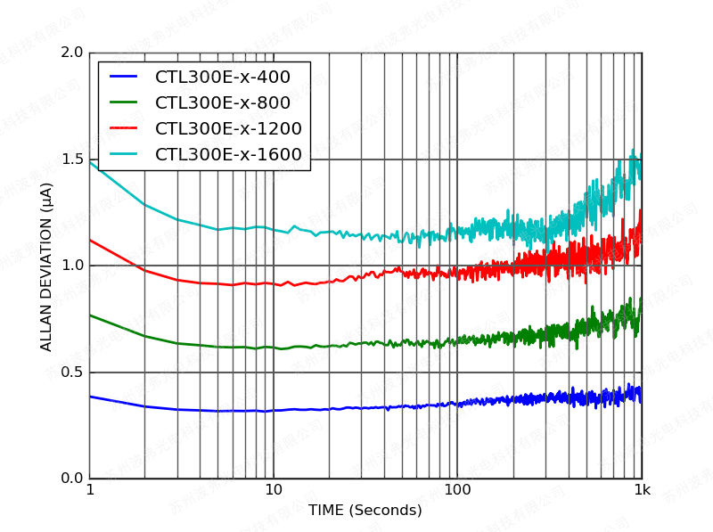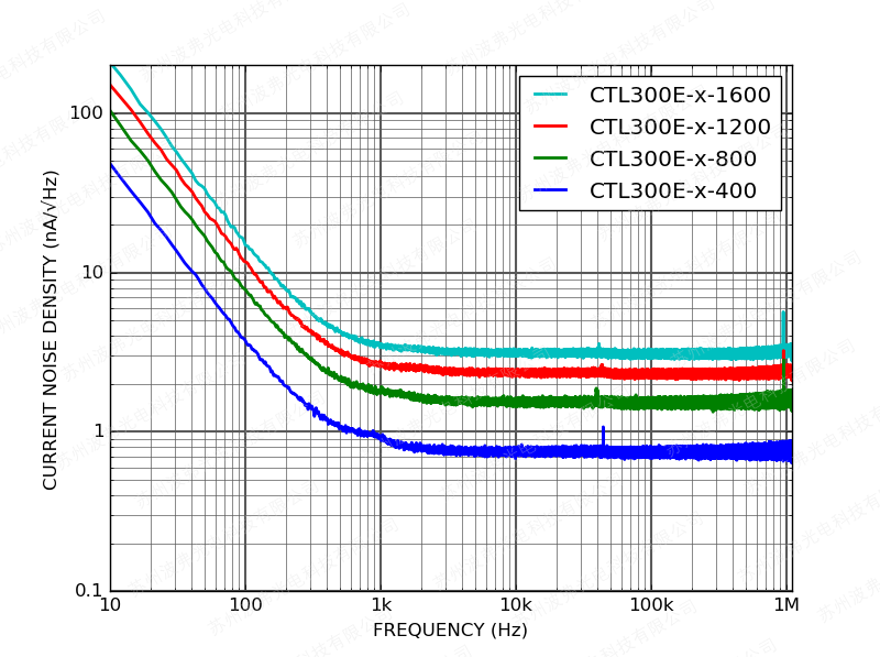 下圖顯示了CTL300E控制器在額定電流和600 mV激光驅動器壓降下工作的電流噪聲密度。