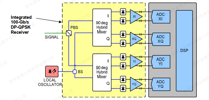 集成的100-Gb/s DP-QPSK接收器將兩個90°光混合器與四對平衡光電探測器(PD)和四個線性TIA集成到單個蝶形封裝中。 與其他不包含偏振分束器(PBS)和/或功率分束器(BS)的技術不同,Optoplex的接收器包含這兩種技術以及光混合器、PD和TIA,以提供完全集成的解決方案,這將使用戶受益 在完全消除光纖路由和傾斜管理方面。 集成接收器以高達32GBaud/s的波特率工作。