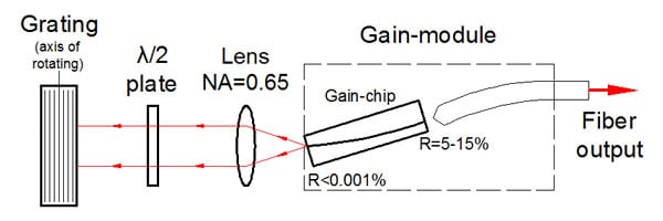 該設備包括帶有彎曲條紋的“C型”增益芯片。條紋傾斜的刻面專為外部反饋而設計,并具有深層 AR 涂層,從而使芯片波導的背反射極低。它確保了自激的阻斷,并消除了在外腔系統中操作時與復合腔相關的問題。這導致在整個調諧范圍內具有高邊模抑制比 (SMSR) 的非常精細的譜線。具有垂直條紋的刻面具有適當的反射率(通常在 5-15% 的范圍內),以同時提供寬波長調諧和高輸出功率。標準器件中這一方面的反射針對在外腔設置中的操作進行了優化,該設置為芯片提供了有效的反饋(約 50%)(如圖所示)。對于反饋較低的方案,我們建議使用在刻面上具有不同涂層的定制設備,以提供優化的反射。