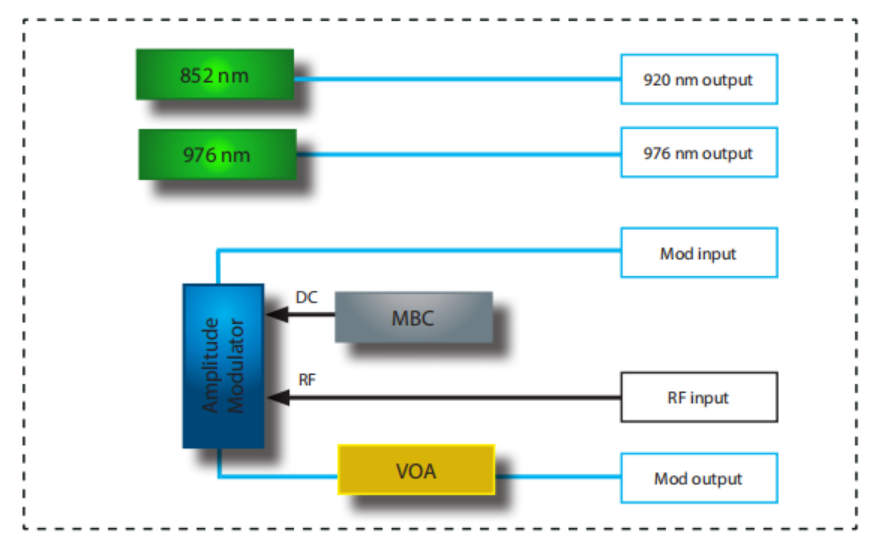 ? 內嵌兩個激光源,一個852 nm和976 nm低RIN DBR激光器。為了便于使用,省略了一根外部接插線,將激光輸出連接到調制器輸入光端口。波長和功率可通過前面板控制或ModBox軟件接口進行調整。