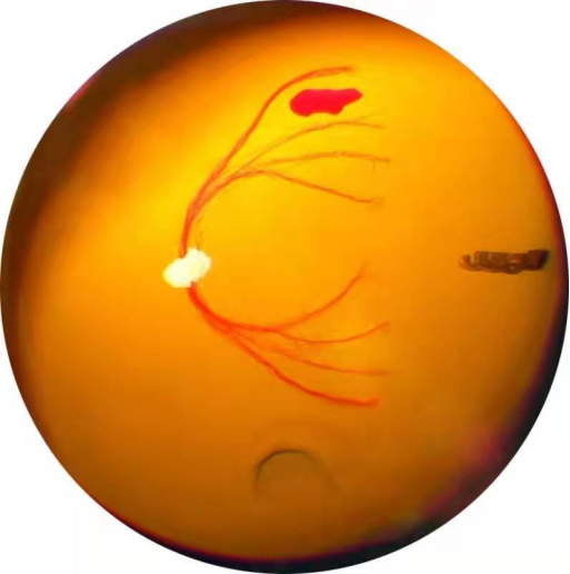 眼睛有視網(wǎng)膜脫離,顯示視網(wǎng)膜升高和視網(wǎng)膜撕裂。